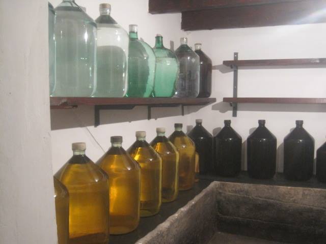 the wine is being stored in glass and wood vessels